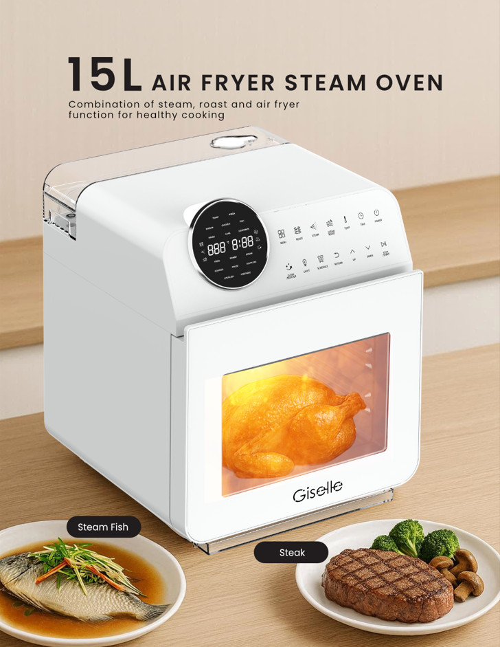 The Giselle Steam Air Fryer Oven enhances home cooking with its approx. 15L large-capacity design and 3-in-1 Steam Air Fry technology. Its advanced Dual Heating Steam Circulation delivers precise temperature control with beautifully tender and juicy results. The refined Smart Touch interface, pull-out water tank, and Auto Clean system provide both convenience and sophistication. A perfect choice for families seeking a premium, intelligent, and healthier cooking experience.