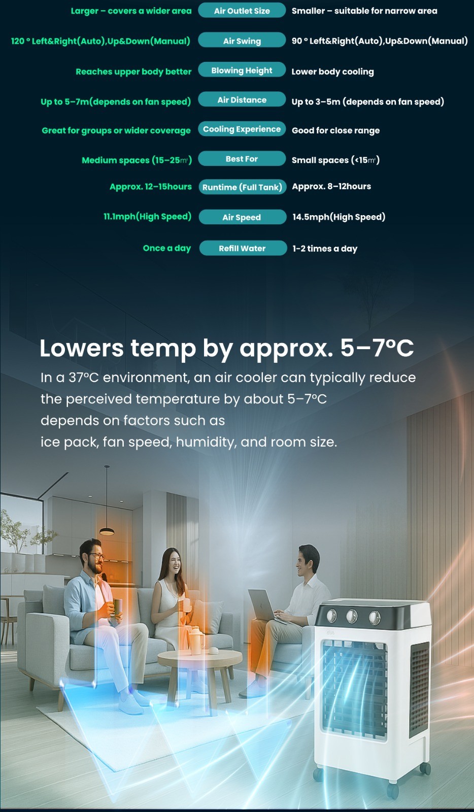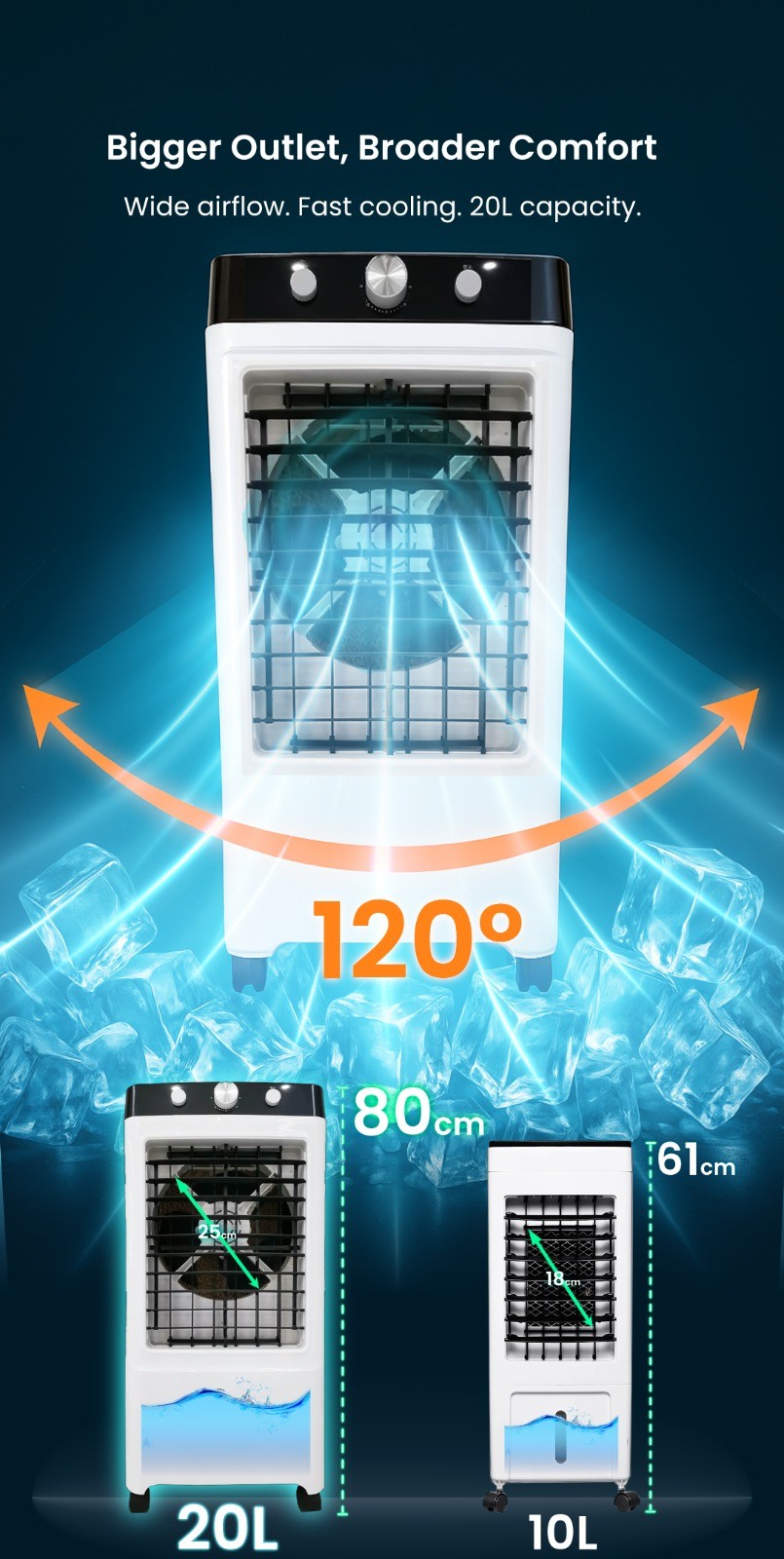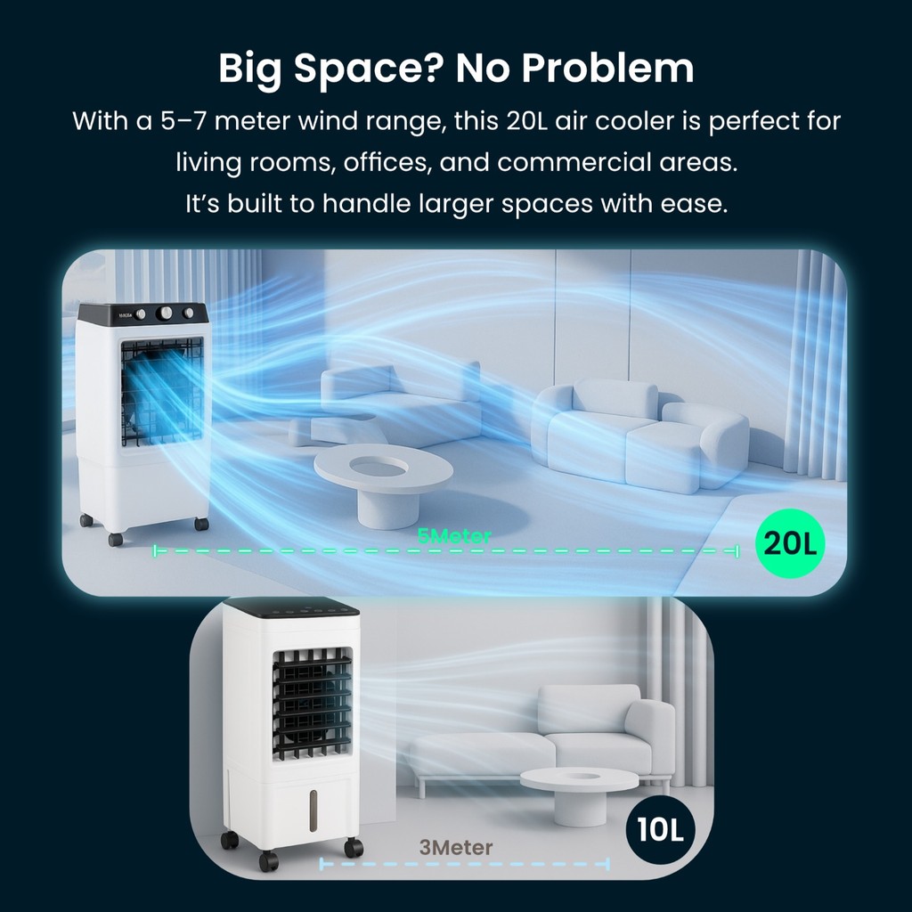 Large 20L Water Tank: Enjoy hours of refreshing cool air without constantly refilling the tank. Perfect for those long, hot days! ️