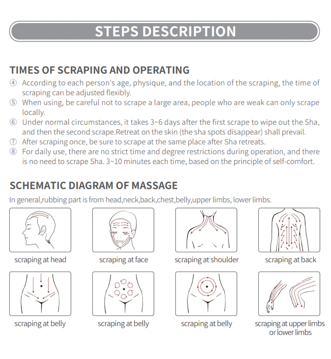 It can be held in one hand, with a delicate body shape to create a warm touch. It can be serve as cosmetic instrument, scraping board, inductor and massager.