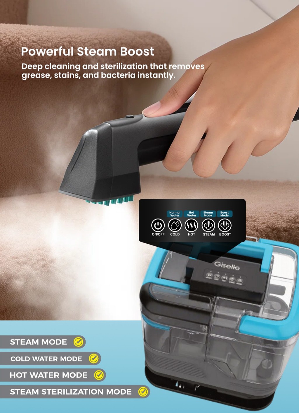 Pembersih Wap Titik Air Panas Giselle 1700W ialah penyelesaian pembersihan rumah yang berkuasa dan serba boleh yang menggabungkan air panas dan wap bersuhu tinggi untuk pembersihan mendalam, pensterilan dan penyahbauan. Dengan sistem dwi motor dan pemanas 1700W yang cepat panas, ia dengan mudah menanggalkan kotoran, minyak dan bakteria daripada lantai, permaidani serta fabrik. Tangki air bersih dan tangki air kotor yang berasingan memastikan proses pembersihan lebih bersih dan bebas pencemaran silang. Ia turut dilengkapi dengan berus wap dan alat pembersih hos bagi memastikan hasil pembersihan yang tepat dan menyeluruh. Reka bentuknya yang padat, mudah alih dan mudah disimpan menjadikannya pilihan sempurna untuk rumah moden yang mahukan pembersihan cekap tanpa bahan kimia.