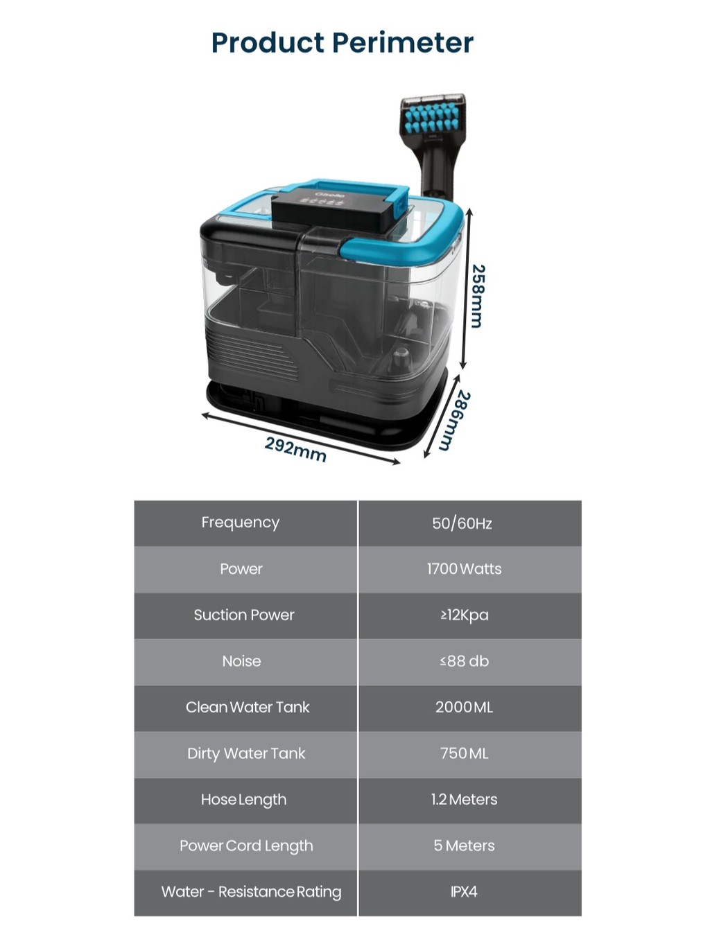 ✅ Type: Hot Water Steam Spot Cleaner / Wet & Dry Portable Cleaner✅ Voltage: 220–240V~, 50–60Hz✅ Power: 1700W (Motor 500W + Heating 1200W)✅ Water Tank: Separate clean & dirty water tanks✅ Max Water Temp: 60°C / 140°F