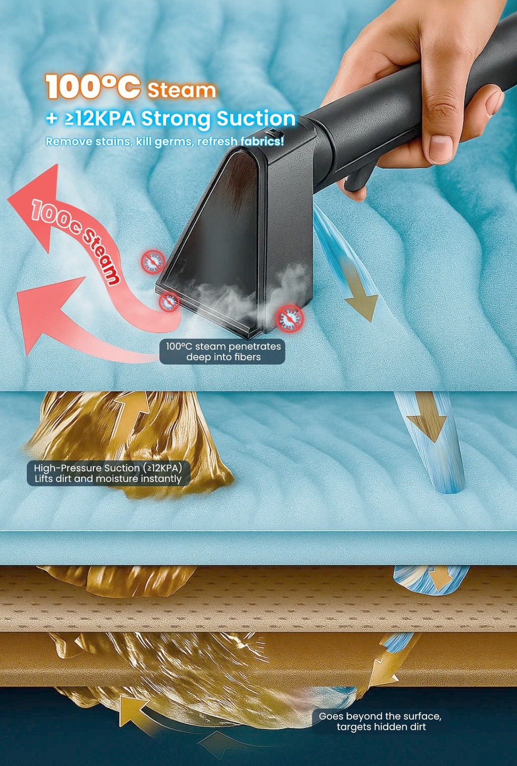 ✨ High-temperature steam kills bacteria and eliminates odor effectively.