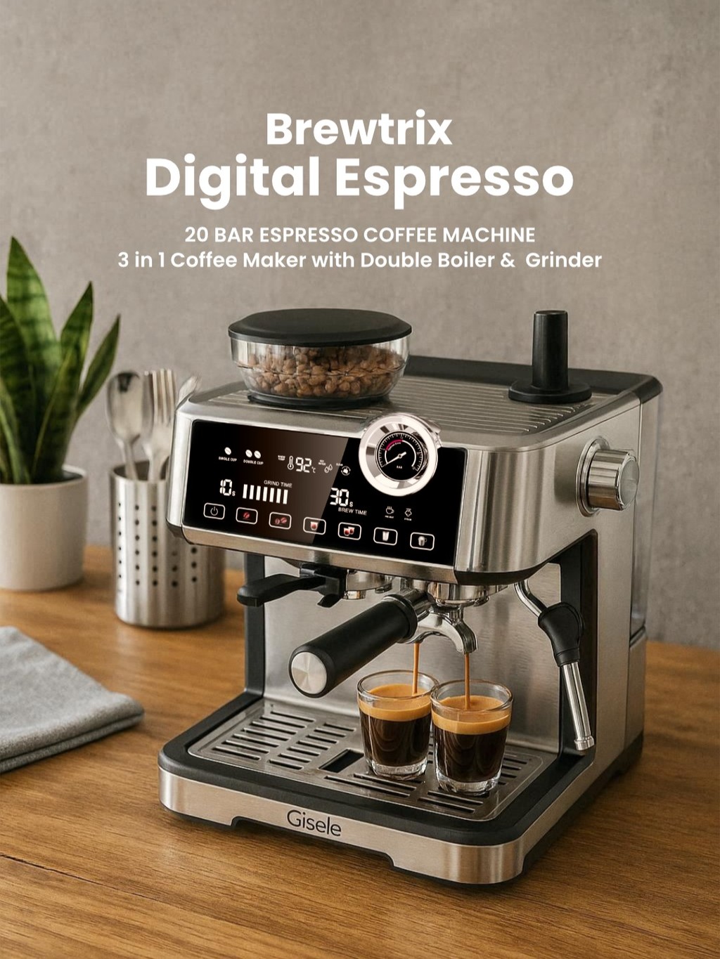 (New Available) Giselle Hot Water Dual Boiler Digital panel Espresso Coffee Maker with Grinder | Adjustable Temp| 20Bar