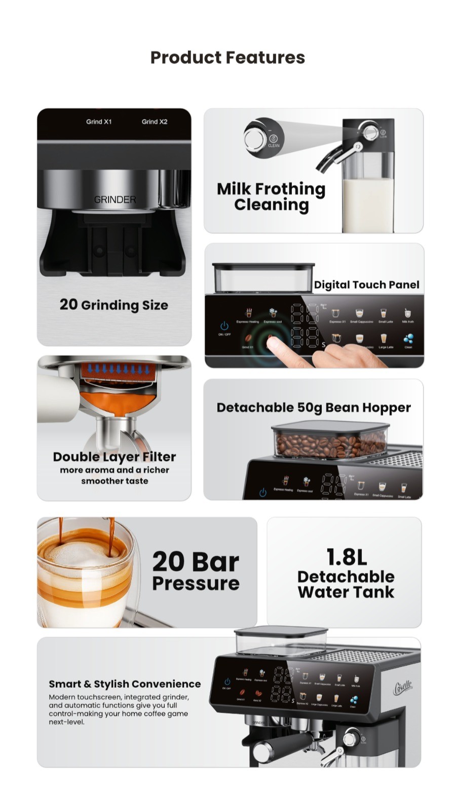 ☕ Multiple Cup Sizes: Brew single or double espresso, latte, or cappuccino — flexible for any moment.